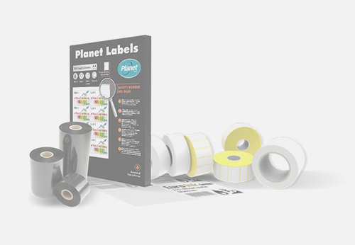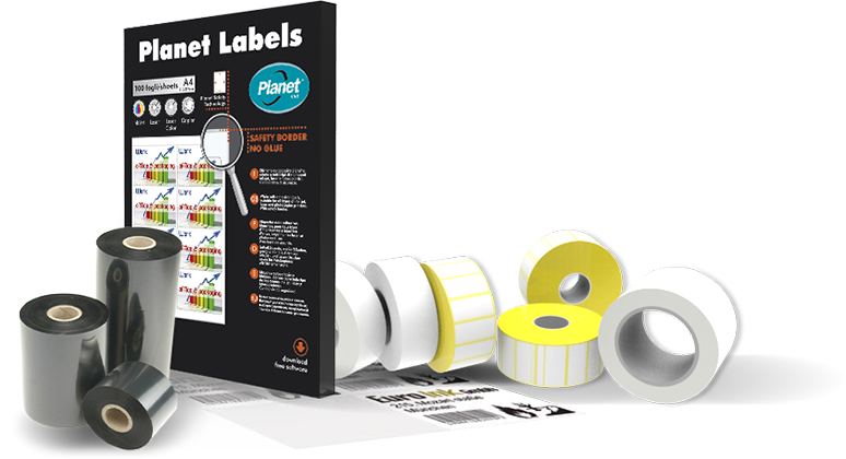 Adhesive labels in roll, in thermal or thermal transfer paper.